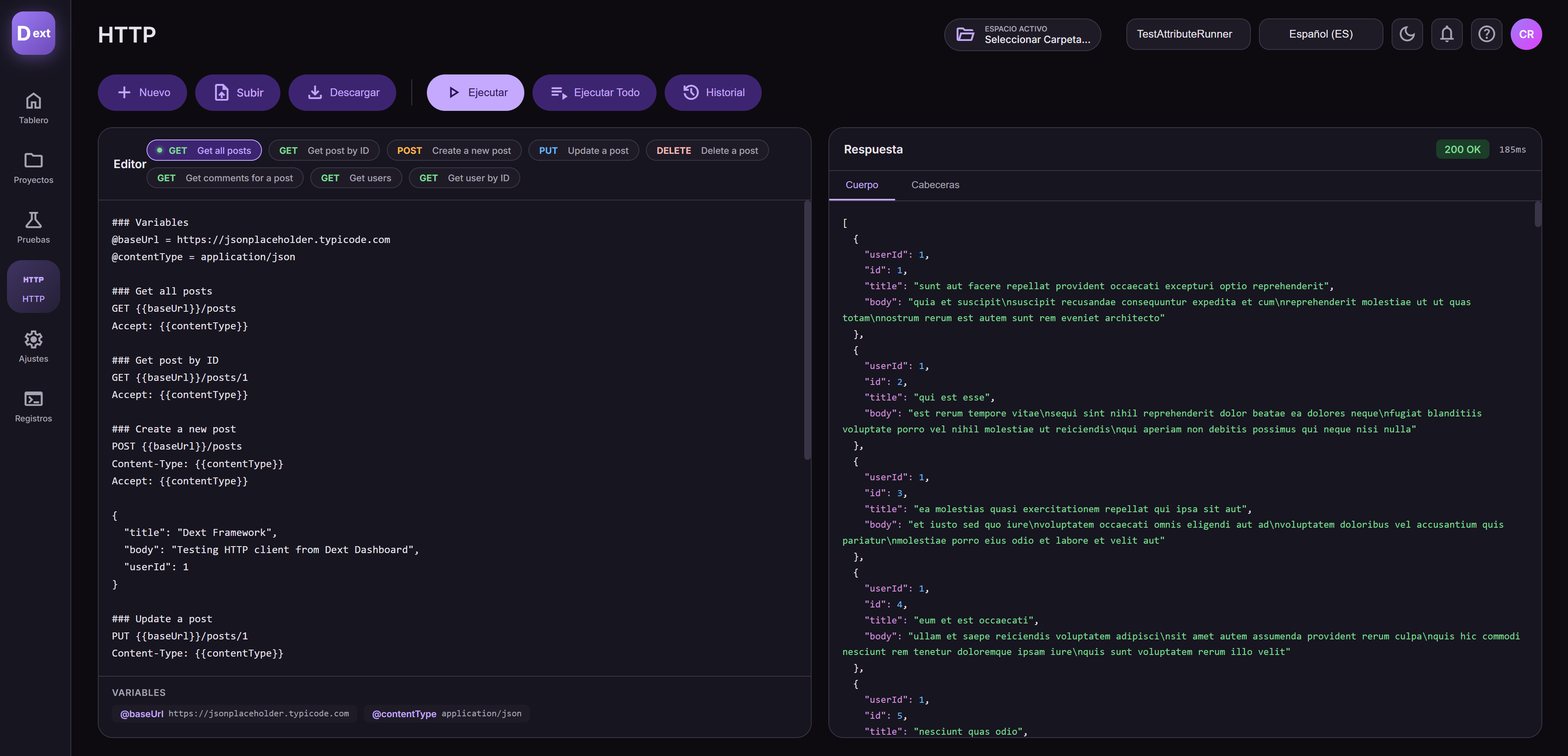 Con Dext Dashboard, ejecutas los propios archivos .http de tu proyecto. Es la misma “fuente de la verdad” para el código, para las pruebas y para el desarrollador.